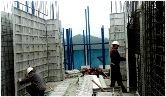 国际广场为创建优质结构工程(楚天杯),采用了一系列全新施工工艺,其中铝模就是本工程的一个亮点,本工程铝模主要使用在2#、3#楼住宅标准层上,现就铝模的施工工艺特点和亮点做以下介绍: 铝模板体系是根据工程建设图纸,经定型化设计及工业化加工,生产出适合工程建设的模板及支撑体系。铝模使用前施工策划和图纸深化是重点,首先要编制严谨的施工组织设计,确定配合铝模施工的二次结构、楼地面、墙面、顶棚等部位工艺做法,铝模在深化设计时要充分结合其他工序,这样才能达到最佳的使用效果。当铝模深化设计时,尽量将外墙洞口两侧的短墙、门洞顶部砌体及过梁、门窗小垛及构造柱结合到铝模图纸中随主体一次性浇筑,施工省时省力。 铝模加工成型后,对模板构件分类、分部位排序,使用时转运到施工现场将各构件“对号入座”,利用销钉组装固定。组装就位后,用钢管立杆做竖向支撑,可调支撑调整模板的水平标高;利用可调斜撑调整模板的垂直度及稳定性;利用穿墙对拉螺杆及背楞保证模板体系的水平刚度。在混凝土强度达到拆模条件后,仅保留竖向支撑,按先后顺序对墙模板、梁侧模板及楼面模板进行拆除,迅速进入下一层的循环施工。下面就从铝模施工工艺流程、铝模施工优点、监理控制、铝模与木模各项指标对比、以及工程图片等几个方面来详细说明。 一、铝模施工工艺流程 剪力墙铝模安装及拆除程序: