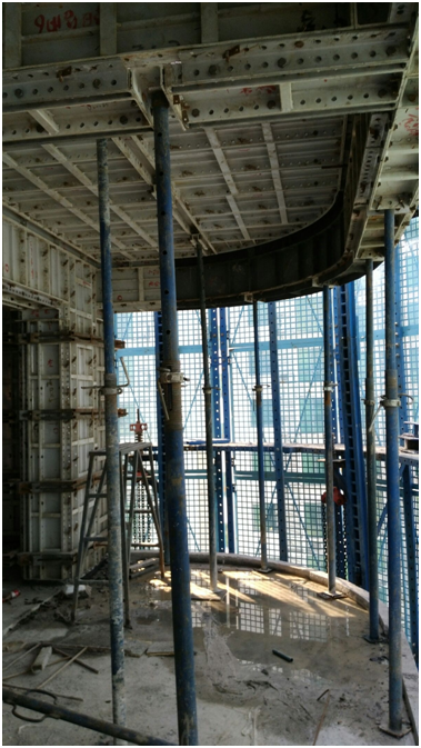铝模梁板安装,中间镂空部位为传料口,方便铝模拆除后从传料口人工往上传递。与传统木模比较,不用卸料平台、不需要用塔吊吊运模板,进而加大塔吊的周转率,加快施工进度。(每块铝模重约10KG)